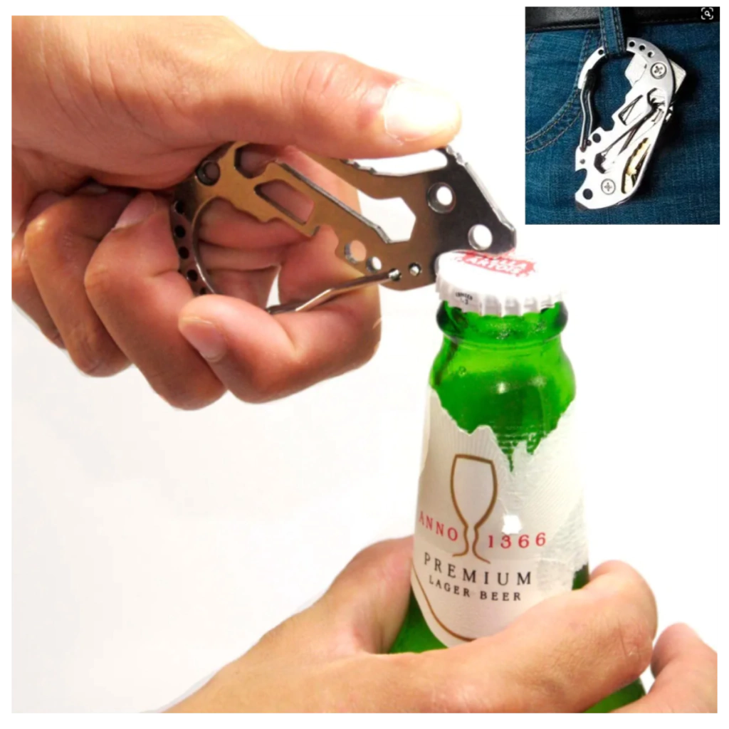 Produzido em Aço Inoxidável, durável e amigo do ambiente suporta até 10 chaves comuns ou 1 chave tetra + 5 comuns. Possui função Abridor de garradas, chave de fenda e chave inglesa.